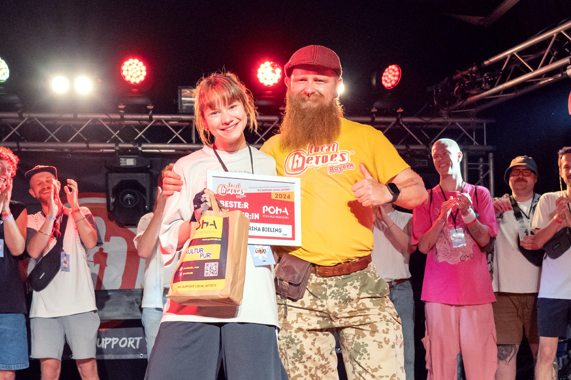 Landesfinalistin Jen Kova hat mit Local Heroes viel erlebt. 2024 war sie nicht nur Teil der BahnhofBeats, sie belegte auch den zweiten Platz im bayerischen Landesfinale. Heute ist die junge Künstlerin dank der Nominierung von Local Heroes Bayern Teil des BY.on Spitzenförderprogramms des Vpby. (Foto: David Lehmann)